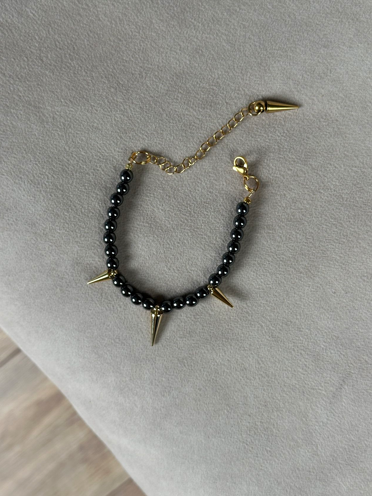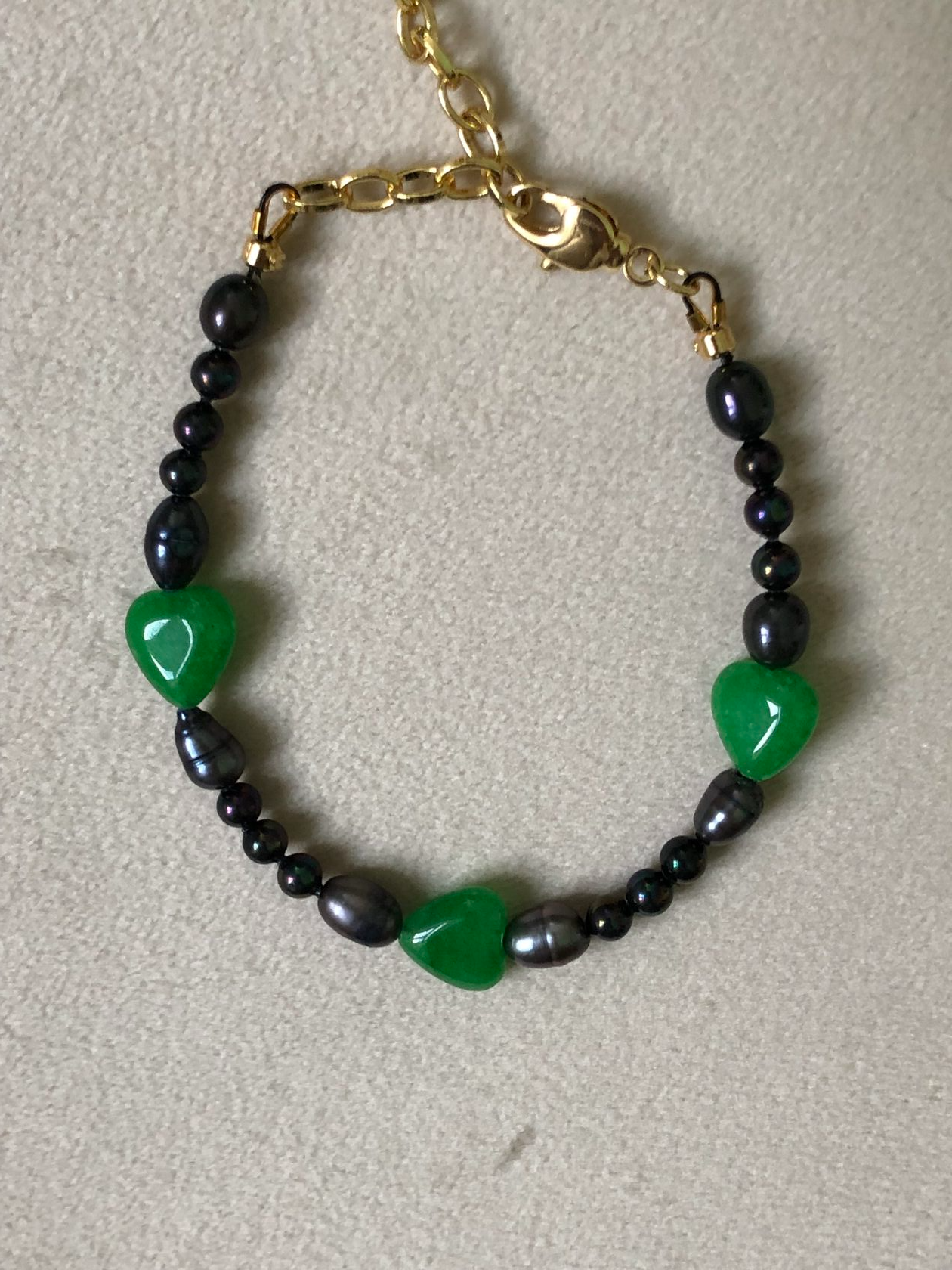 Натуральный чёрный жемчуг, жадеит в виде сердец, латунь с позолотой 18k