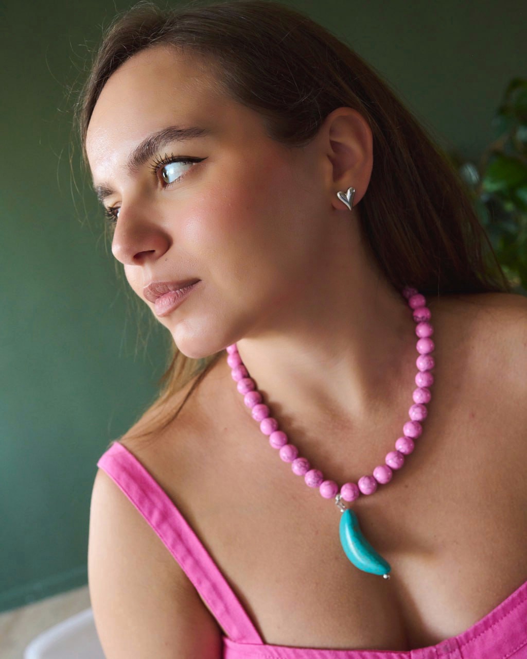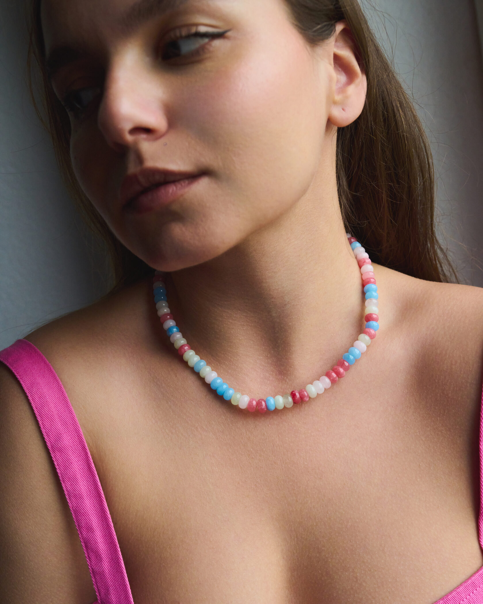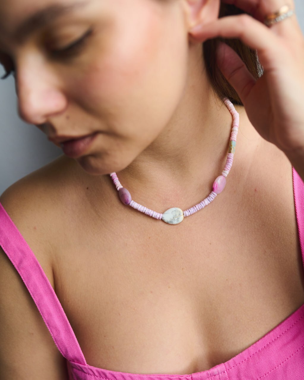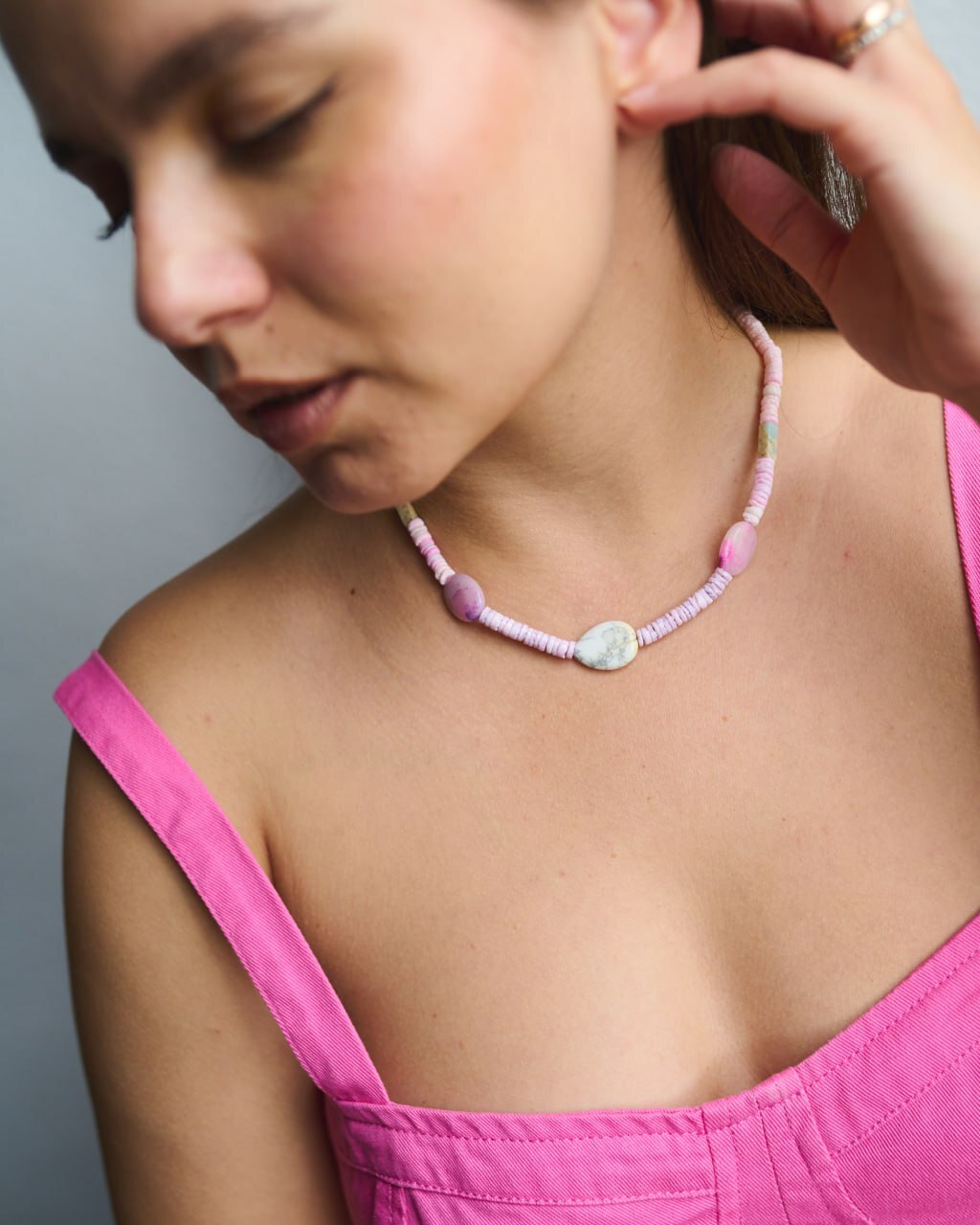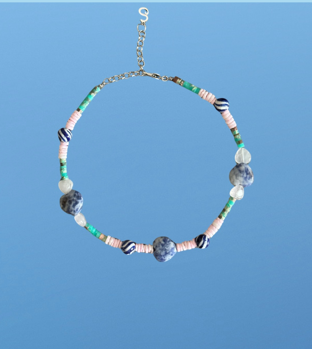 Серпентин, голубой полосатый агат, керамика, ракушки, розовый кварц