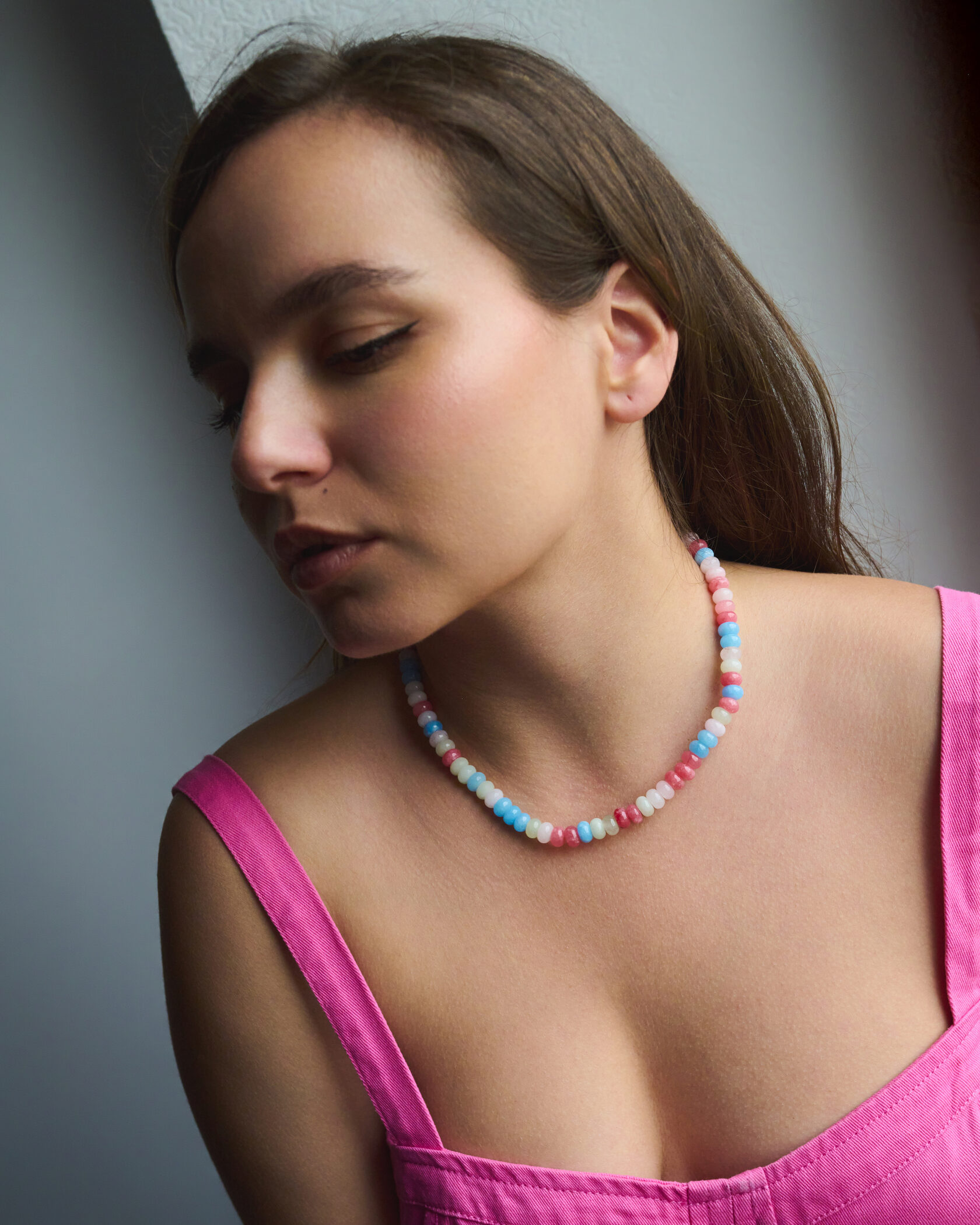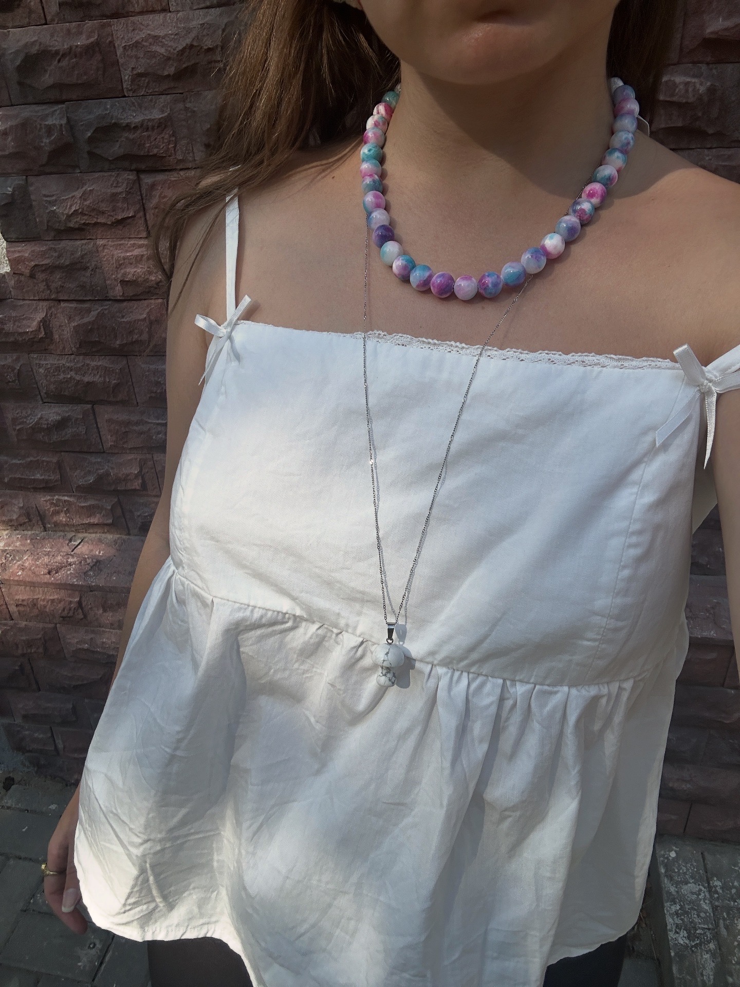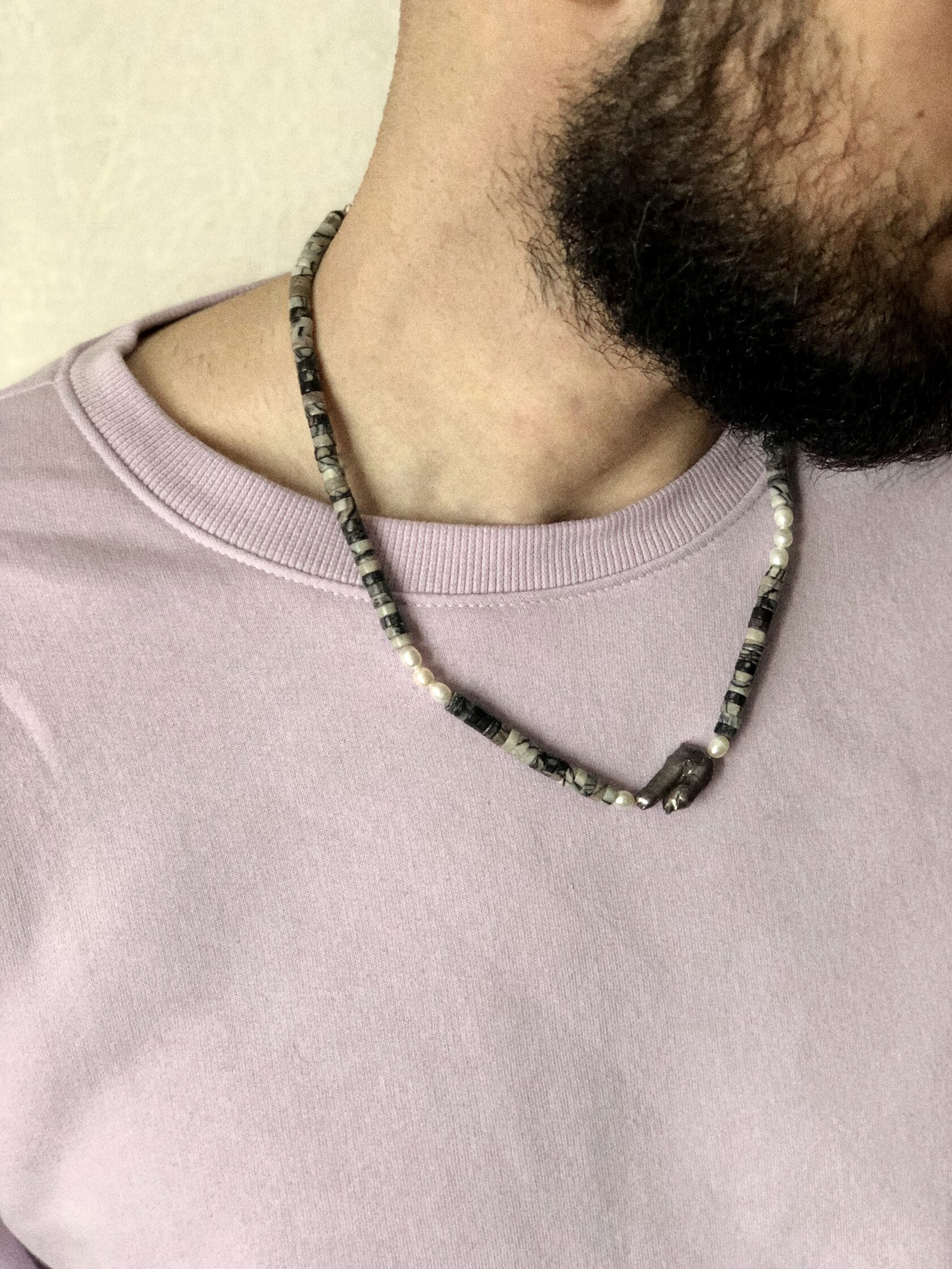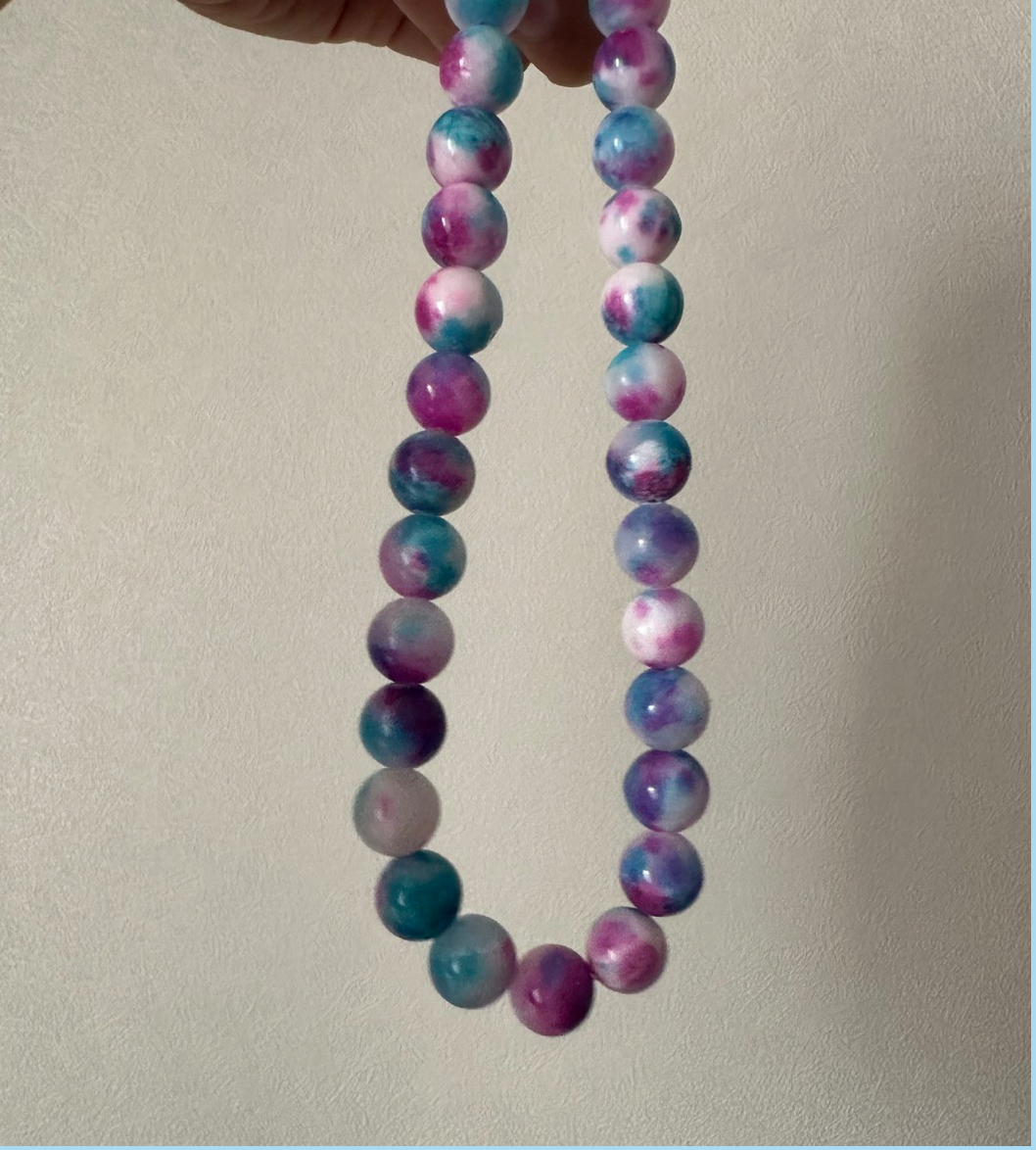 Серпентин, голубой полосатый агат, керамика, ракушки, розовый кварц