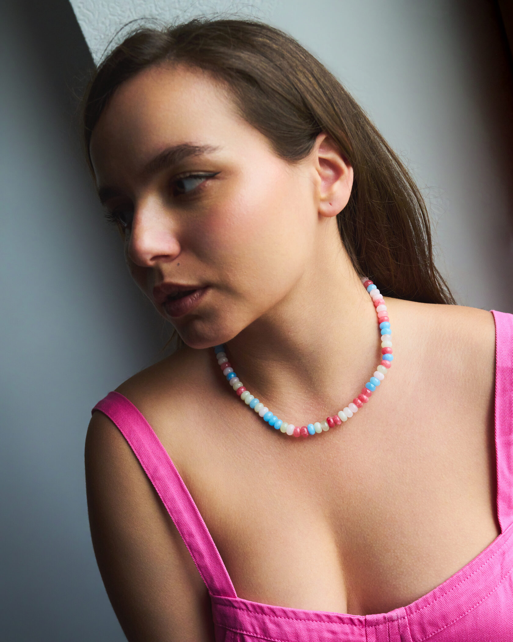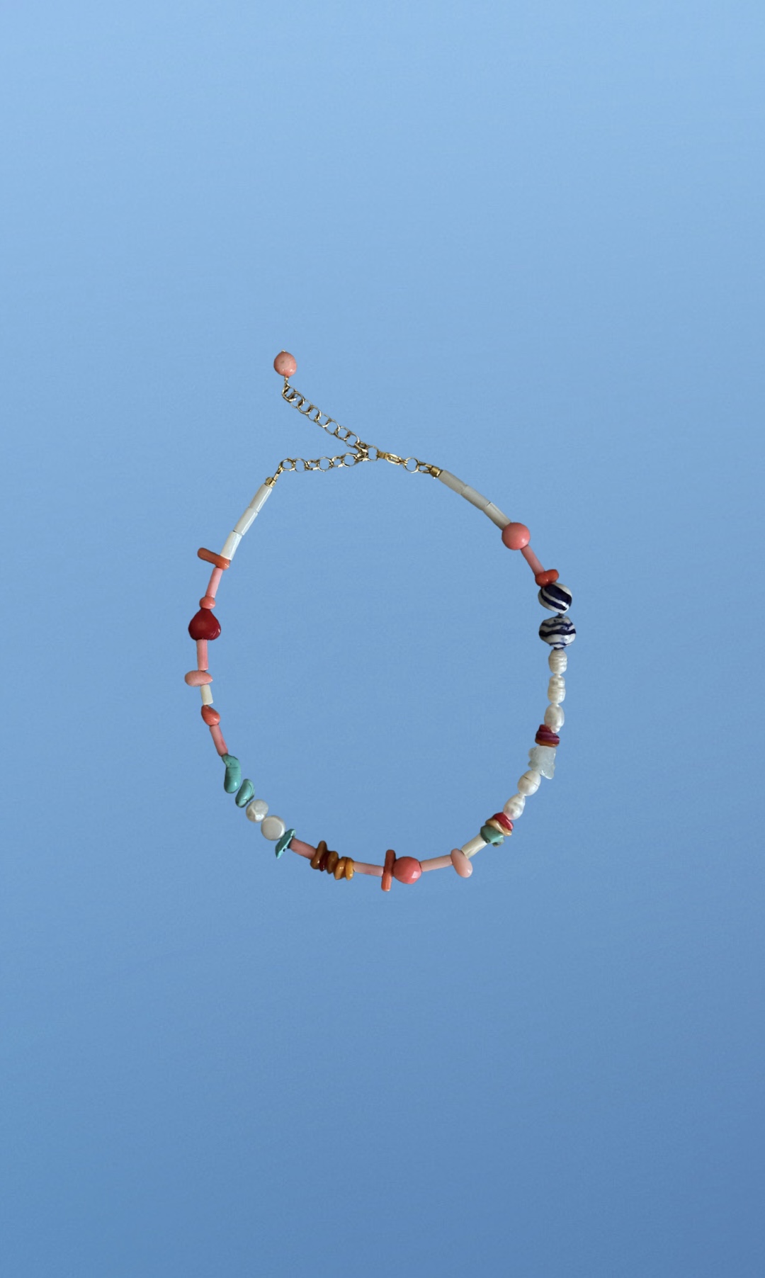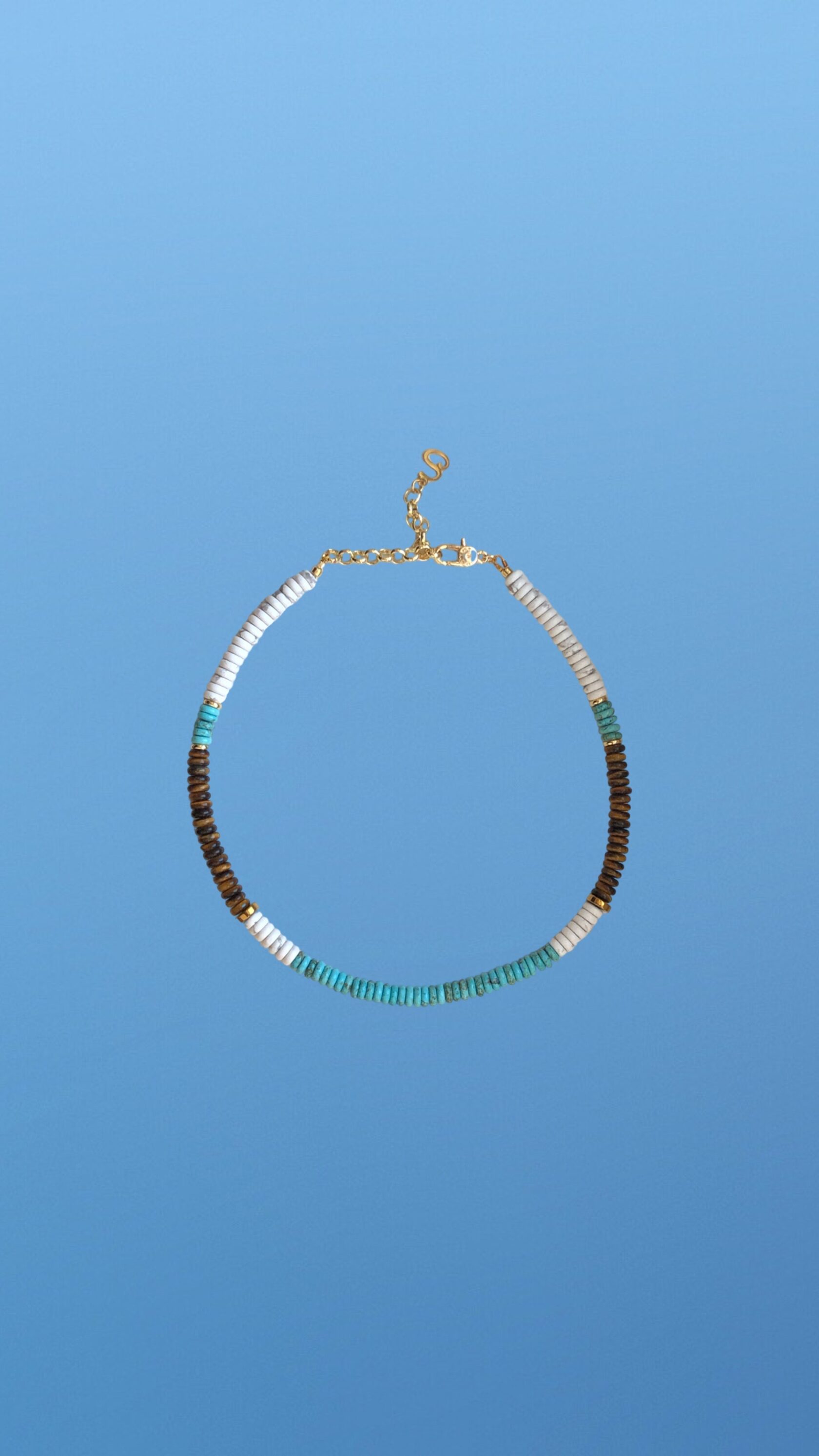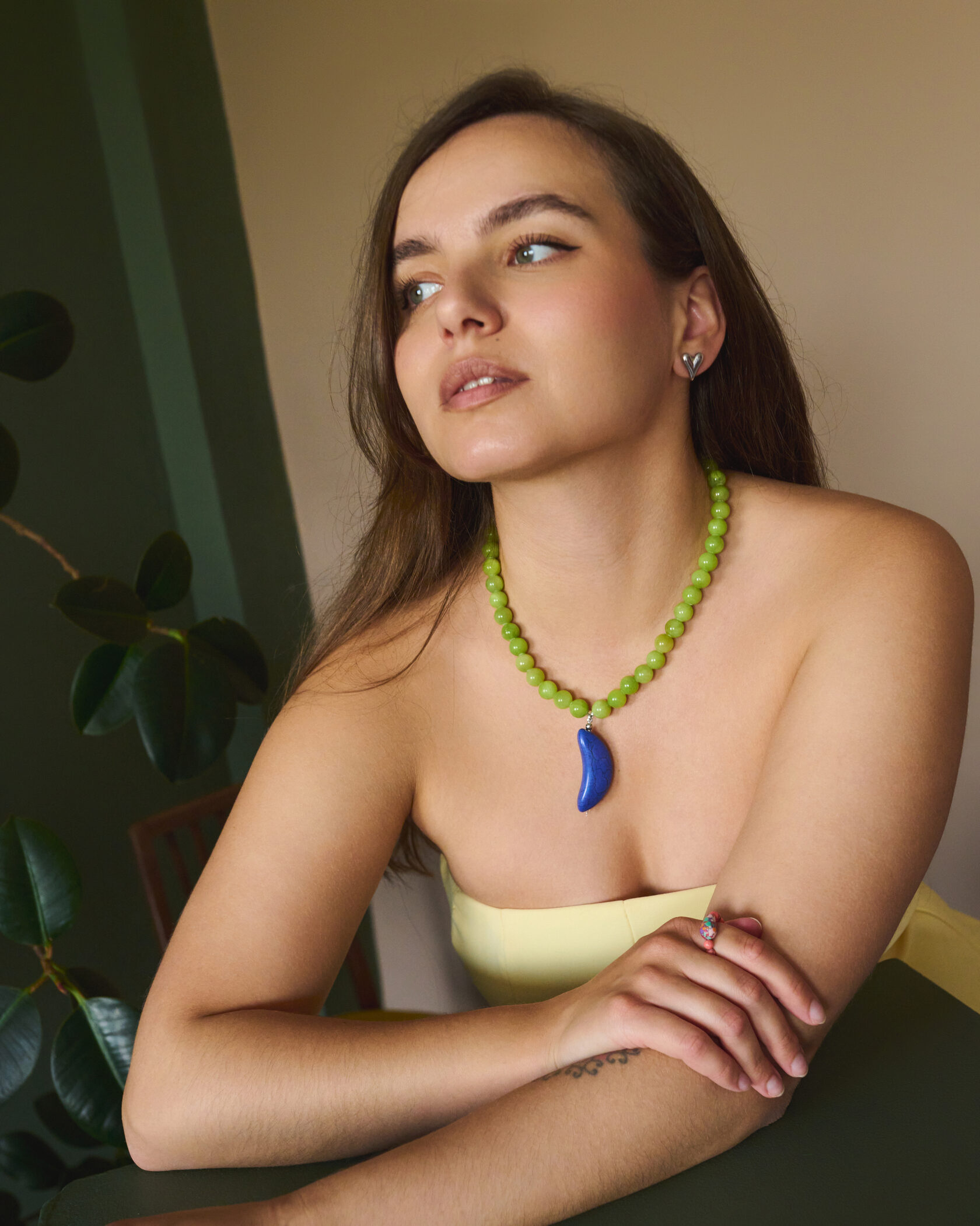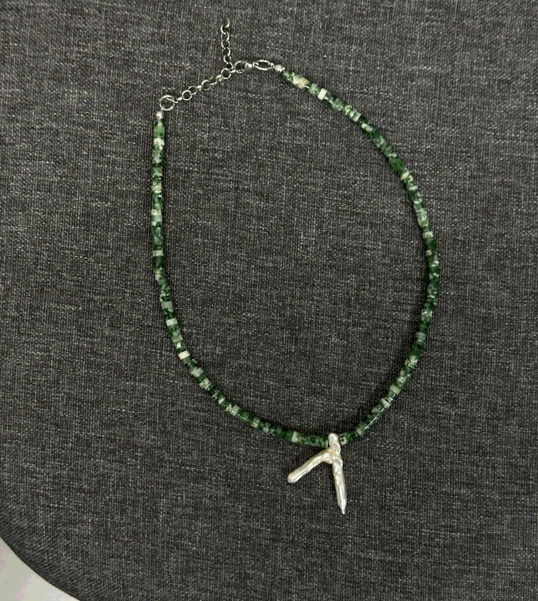 Серпентин, голубой полосатый агат, керамика, ракушки, розовый кварц